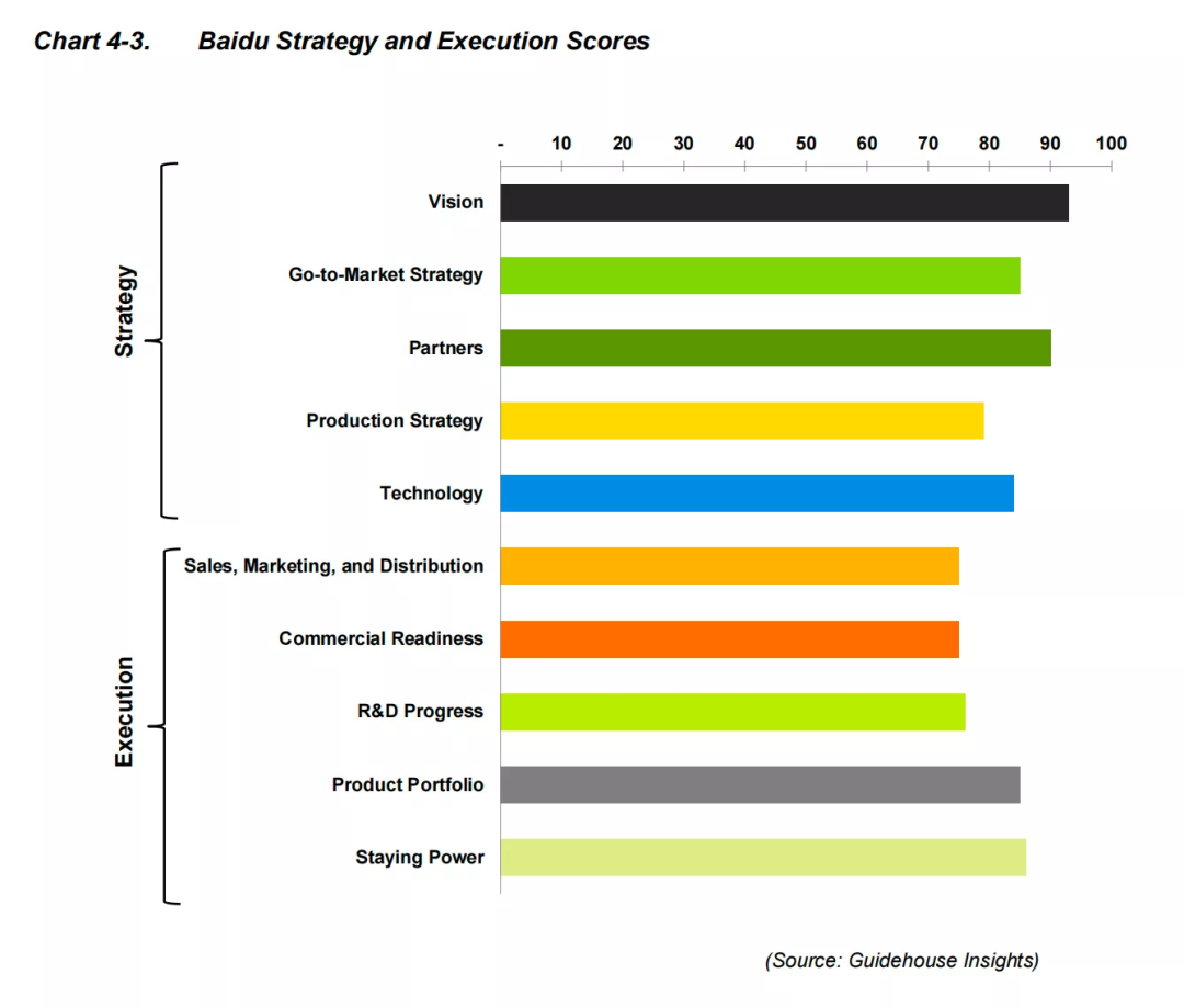 在Guidehouse Insights给出的各个参数标准上,百度都得到了不错的分数,特别是在市场需求匹配性(Vision)方面,分数最高。