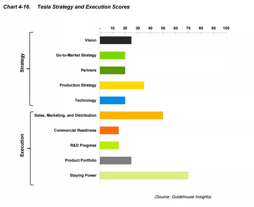 从报告来看,销量上深受大家喜爱的特斯拉排名最末,无论是战略层面还是执行层面,都位列末位。是上榜公司里唯一一家横坐标与纵坐标均属于“跟随者”的玩家,也是榜单中是唯一的“追随者”。