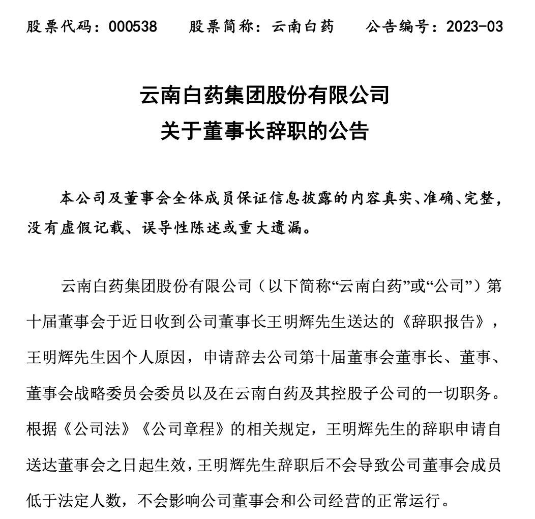 昨晚,云南白药发布公告称,董事长王明辉递交《辞职报告》,因个人原因,申请辞去公司第十届董事会董事长、董事、董事会战略委员会委员,以及在云南白药及其控股子公司的一切职务。