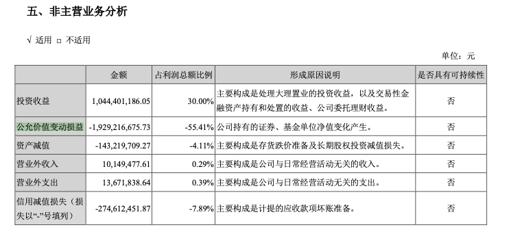 而在公司的非主营业务分析中显示,云南白药公允价值变动损益减少约19.3亿,占利润总额比例为-55.41%。