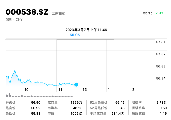 今天一大早,云南白药以每股56.9元的价格开盘,较昨日57.77元的收盘价,下跌1.5%,截止午间休盘,云南白药每股报价55.95元,持续下跌,市值1005亿。