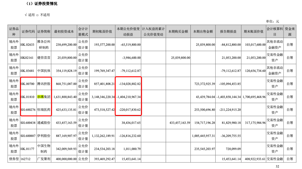 2021年年报显示,云南白药公允价值变动损益减少约19.3亿元,持有的部分股票市值大跌,其中,仅投资小米一家就亏了14亿。