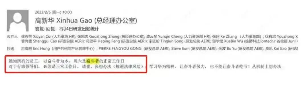 “通知所有的员工,以奋斗者为本,周六是奋斗者的正常工作日。对于行政的领导们,必须是正常工作日。请崔、张想办法(规避法律风险)。学习华为精神,让奋斗者努力,也不能让奋斗者吃亏!从机制上想办法。”