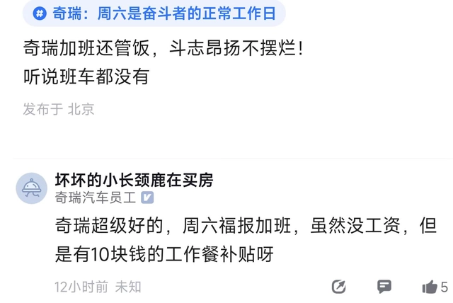 在脉脉上认证为奇瑞汽车员工的网友则表示,“奇瑞超级好的,周六福报加班,虽然没工资,但是有10块钱的工作补贴呀”。