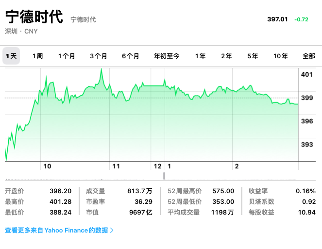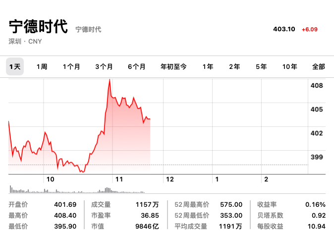 今年一大早,宁德时代以401.19元/每股高开1.18%。盘中跌至395.9元,截止今日午间休盘,每股报价403.1元,市值为9846亿。