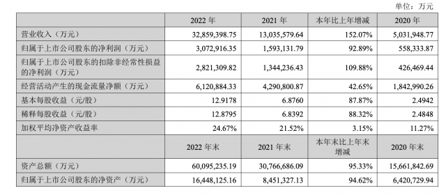 营收方面,2022年,宁德时代实现营业收入3285.9亿元,同比增加152.07%,这也是宁德时代营收首次突破3000亿元。
