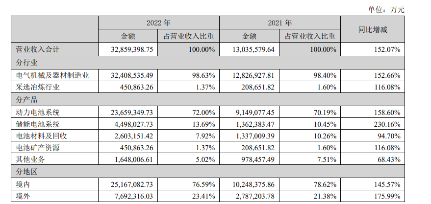 营收和净利润实现双突破的同时,还斩获了2022年全球动力电池装机量和储能电池出货量“双料冠军”。