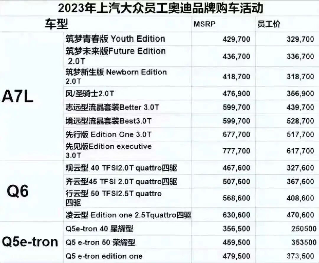 不止宝马,有网友透露,奥迪也在加入这场价格战中,5月底奥迪A6价格将会降至30万以内,目前已有地区裸车价为28万,直至降至22万。目前这个消息还未得到官方验证。