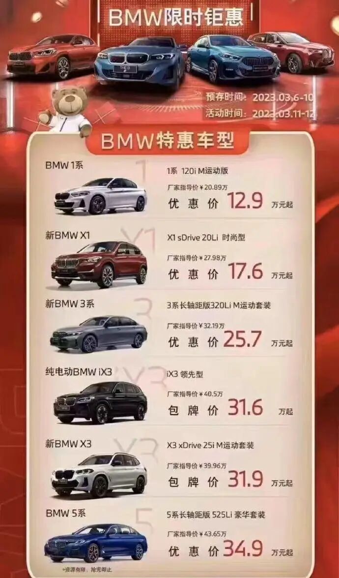 其他车型也有不同程度降价,比如X1 sDrive 20Li时尚型厂家指导价为27.98万元,优惠后价格低至17.6万元。原价40.5万元的iX3领先型,优惠后低至31.6万。针对这个消息有宝马4S店回应称,这个价格还买不了。