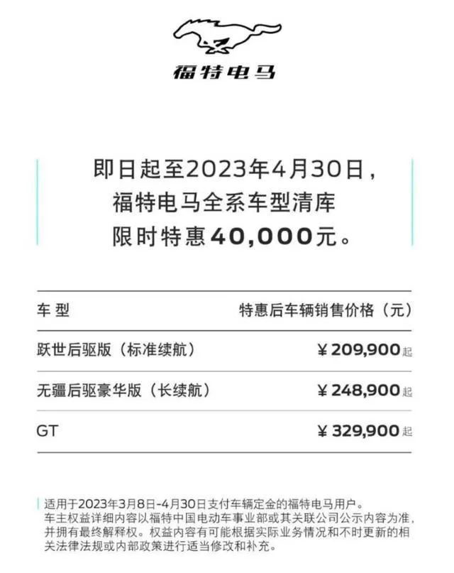 3月8日,福特旗下纯电品牌Mustang Mach-E官宣,全系降价4万元,降价后车辆售价区间为20.99-32.99万。