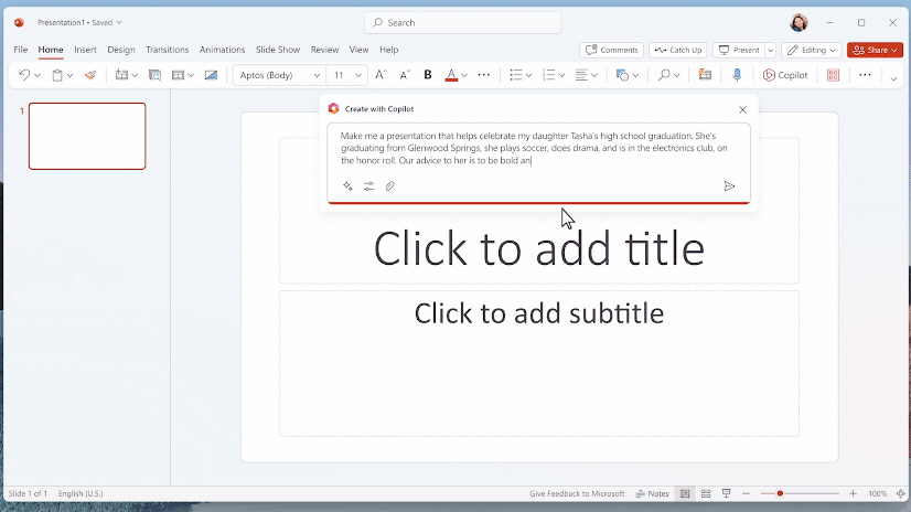 有地方不满意?直接命令Copilot,修改第二页PPT、简化内容、增加数据、替换图片(可以从OneDrive云盘直接加载图片、添加动画等)。