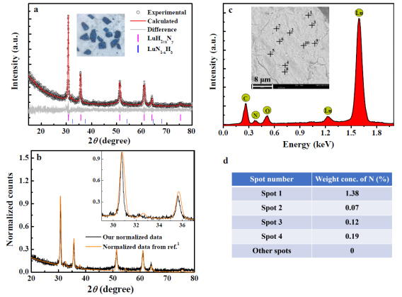 于是他们结合自己的条件,采用了高温高压炉来煅烧进行合成并成功得到了镥氮氢材料,颜色是深蓝色。X射线衍射仪技术检查显示,该材料结构与Dias的样品几乎一致,且能量色散X射线光谱仪分析也发现了氮元素。