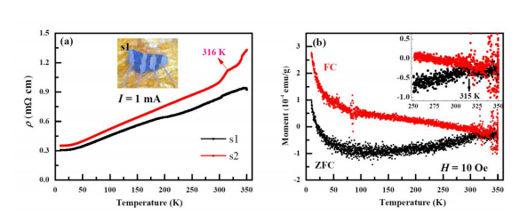 磁化温度依赖性显示在100至320 K之间大致为平坦特征,并且磁化在100 K时随着磁场增加而增加,这些都不符合在100 K时的超导性质。