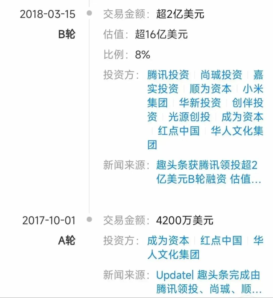 紧接着半年之后,在2018年3月,趣头条宣布完成超过2亿美元的B轮融资,本轮融资由腾讯领投,在跟投公司中,还有了小米、华新致远、光源资本等公司的身影,在B轮融资之后,趣头条估值超过16亿美元。