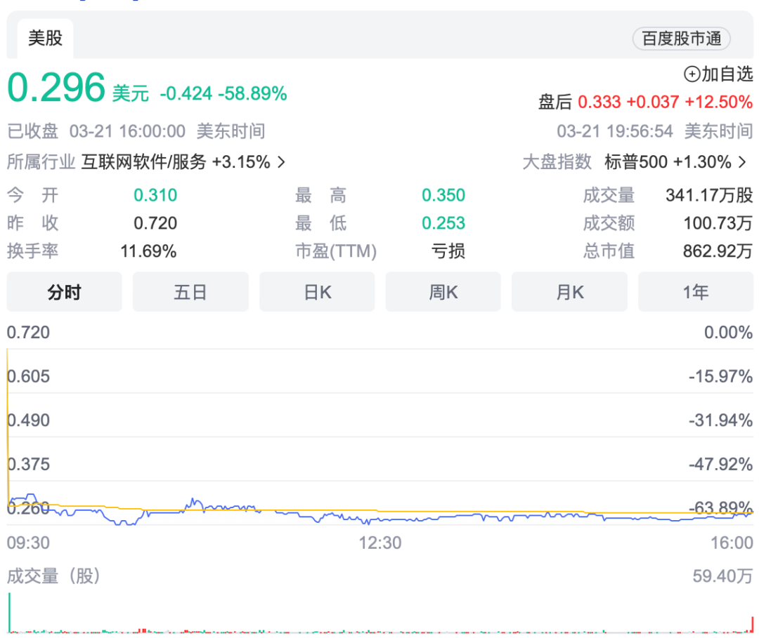 如今市值已经蒸发99%,截至发稿,股价仅为0.296美元,市值为862.92万美元。
