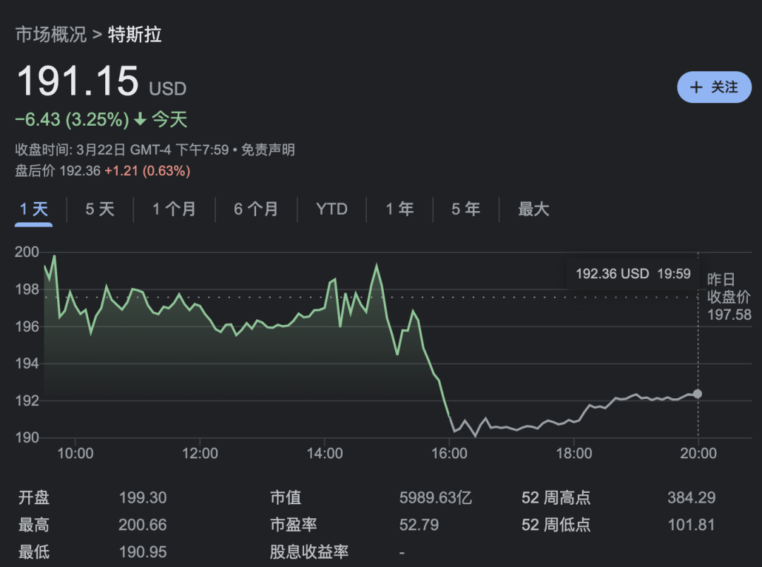 截至美股周三收盘,道琼斯指数跌1.63%,标普 500 指数跌 1.66%,纳斯达克综合指数跌 1.60%,大部分科技股也随之下跌,特斯拉股价跌3.25%,市值一夜蒸发203 亿美元(约人民币1397 亿元)。