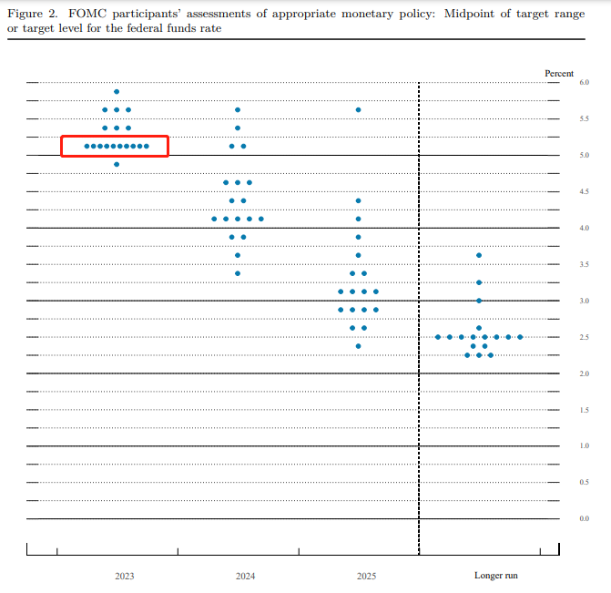 根据美联储发布的新“点阵图”,是各位官员对于加息的观点。在参加会议的 18 名官员中,有 17人预计,联邦基金利率将在今年年底前至少升至 5.1%。