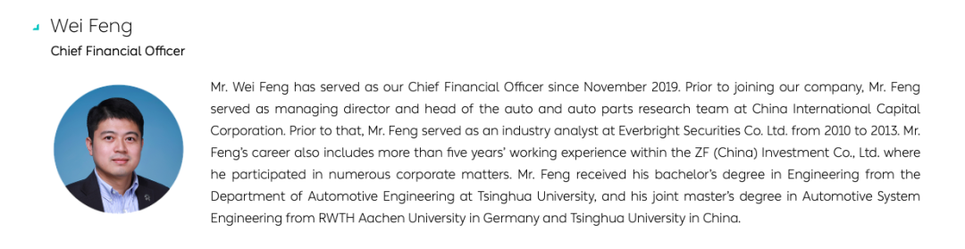 在蔚来的管理团队里是这样介绍的:奉玮从2019年11月加入蔚来,一直担任蔚来的首席财务官。