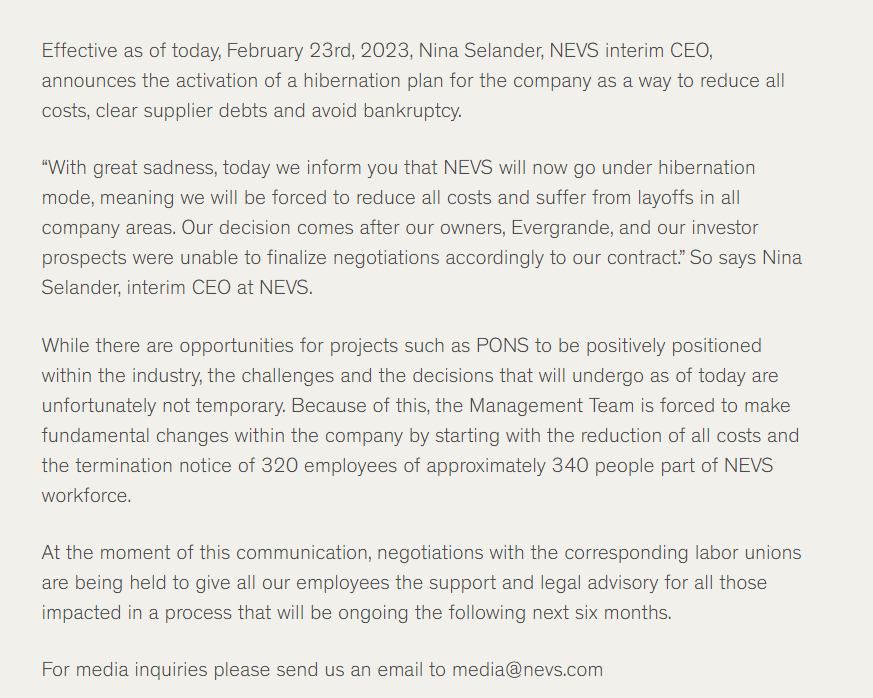 事实上,NEVS公司前段时间已经官宣了自己要裁员的消息。作为降低成本和避免破产的一部分,瑞典全球电动汽车公司(NEVS)宣布启动“冬眠计划”。