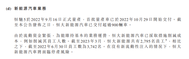 由于流动资金紧张,为维持基本的业务运营,恒大新能源汽车已采取措施削减成本,例如削减其员工人数。