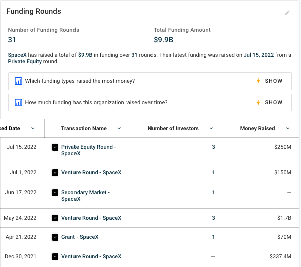 根据美国投资数据公司Crunchbase统计,SpaceX自成立以来已经累计融资31轮,融资总额高达99亿美元。在沙特和阿联酋最新一轮的投资后,Spacex的估值预计将接近 1400 亿美元。
