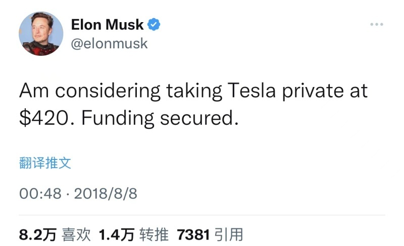 起因还是2018年8月那个著名的私有化特斯拉的推特,当时马斯克声称“Funding secured”,资金已到位。