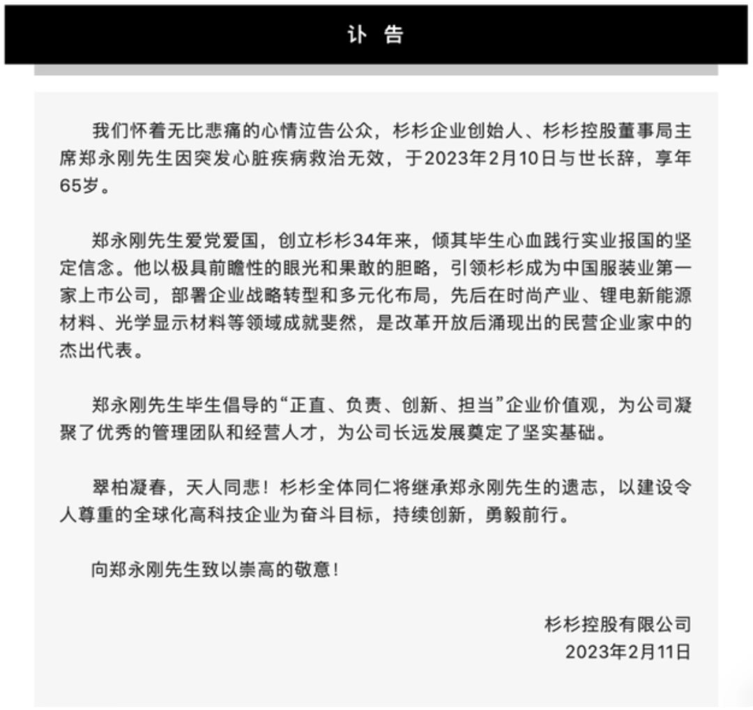 2月11日,杉杉控股发布讣告,杉杉企业创始人、杉杉控股董事局主席郑永刚先生因突发心脏疾病救治无效,于2023年2月10日逝世,享年65岁。