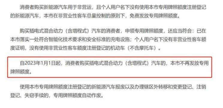 比如2022年底,上海率先开始改变绿牌政策,发布公告表示自2023年起,插电混动和增程式车型就不再发放新能源汽车专用牌照额度。