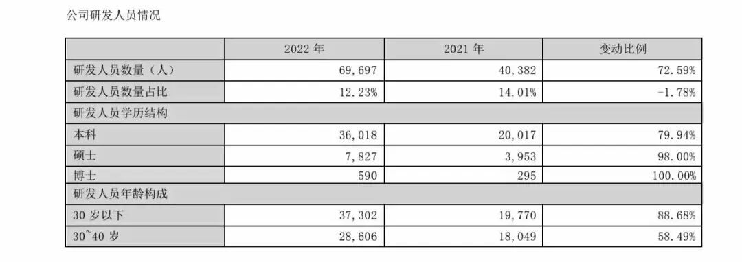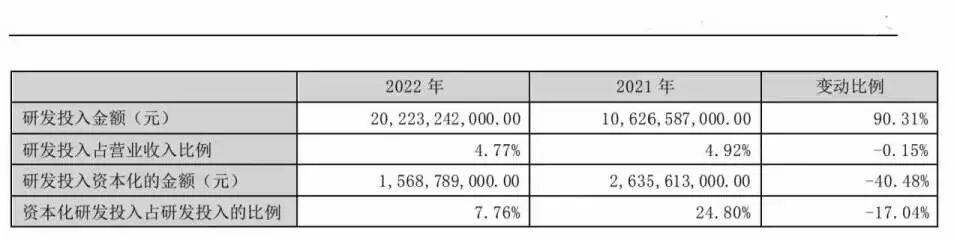 2022年,比亚迪在研发投入增长研发投入增长90.31%至202.23亿元。