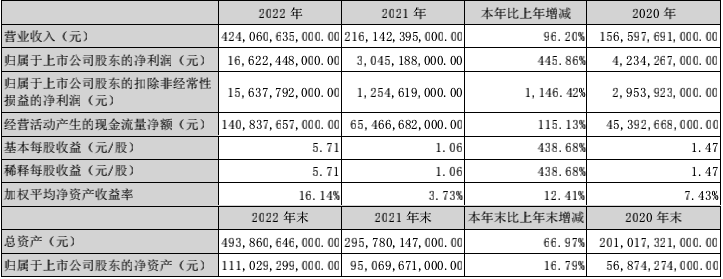 2022年比亚迪营业收入约4240.61亿元,同比增加96.2%,归属于上市公司股东的净利润为166.22亿元,同比增加445.86%,基本每股收益5.71元,同比增加438.68%,经营活动产生的现金流量净额1408.38亿元,同比增长115.13%。