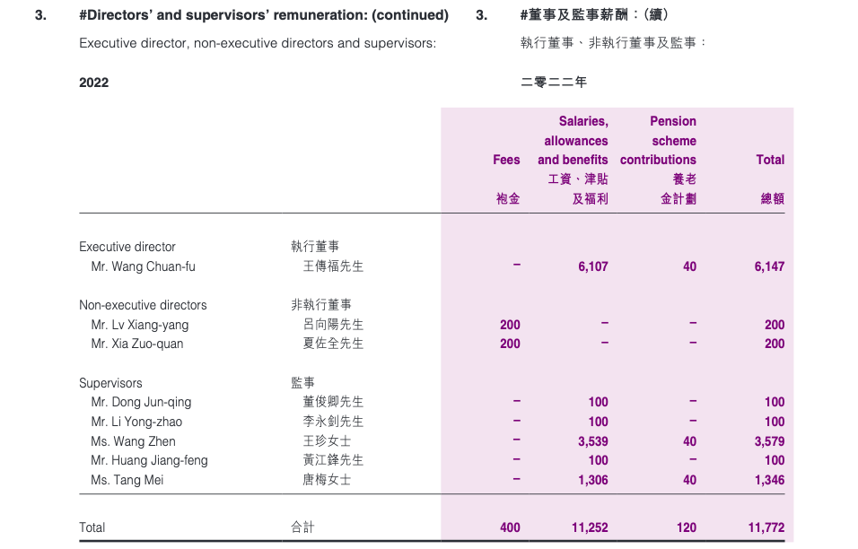 而23位比亚迪高管,工资输出共计9265万元,其中董事长王传福一人的年薪为615万。