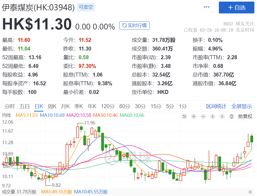的确,伊泰煤炭在港股股本只有3.26亿股,港股股本市值为36.84亿港元。从昨天的数据来看,成交量仅有360万港元,换手率仅仅为0.1%,从长远来看,港股动态市盈率只有2.28倍。