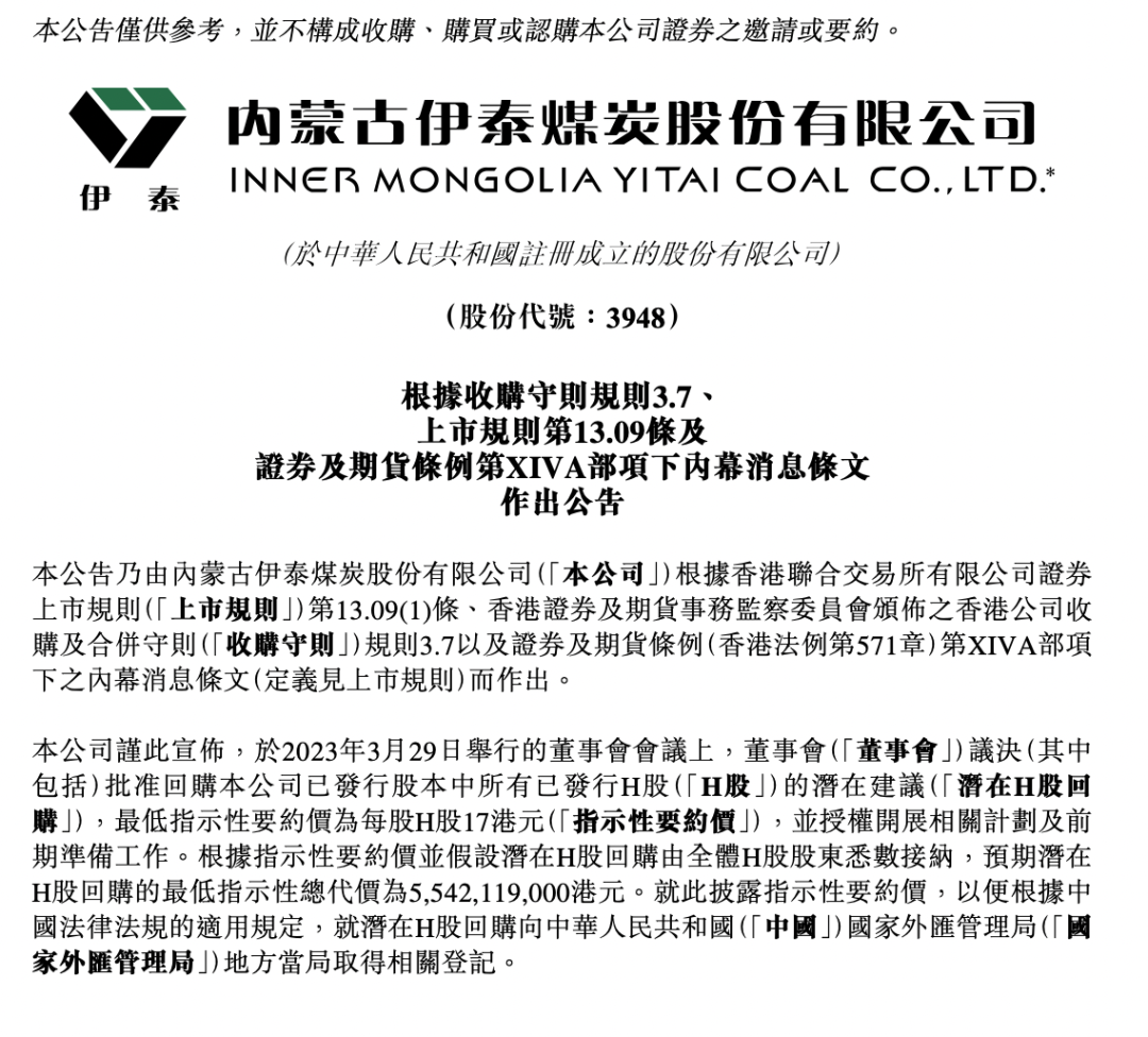 在3月29日晚间举行的伊泰煤炭董事会会议上,董事会议决批准了回购公司已发行股本中所有已发行H股的潜在建议(潜在H股回购),最低指示性要约价为每股H股17港元,并授权开展相关计划及前期准备工作,预期潜在回购的最低总代价为55.42亿港元。