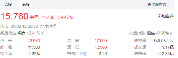 受此消息影响,今天伊泰煤炭泰煤炭早盘高开近15%,最高报价15.88港元,涨幅最高接近48%截至发稿,伊泰煤炭报价15.76港元。