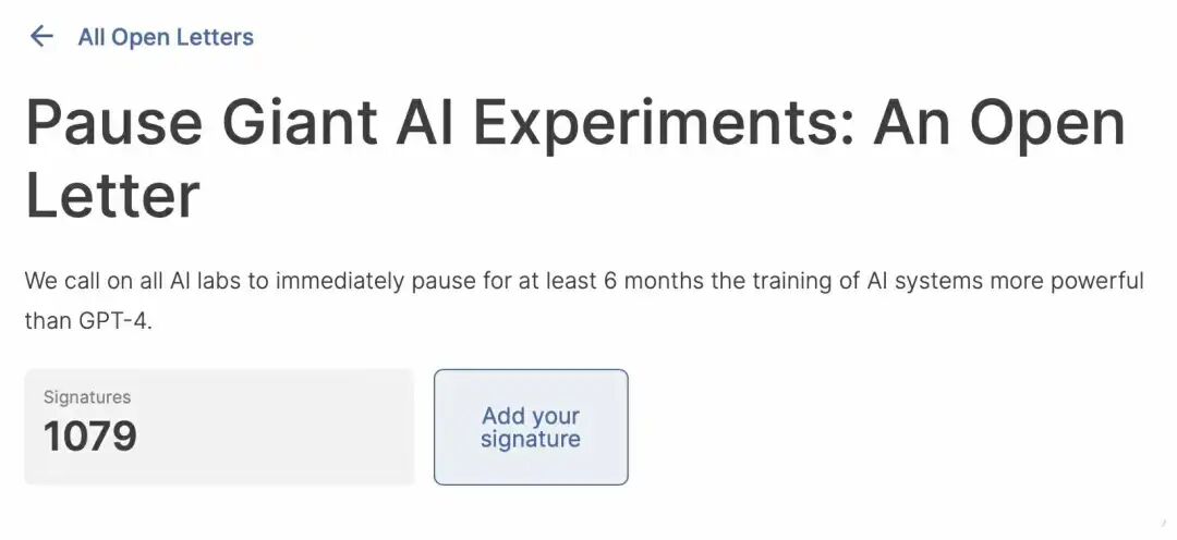 在3月14日,OpenAI发布了GPT-4之后,又引起一片哗然,接着在美国非营利组织未来生命研究所(Future of Life Institute)发布了一封名为“暂停巨型AI实验”的公开信。
