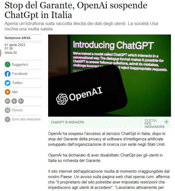 个人数据保护局还表示,已暂时限制ChatGPT使用意大利用户的个人数据。