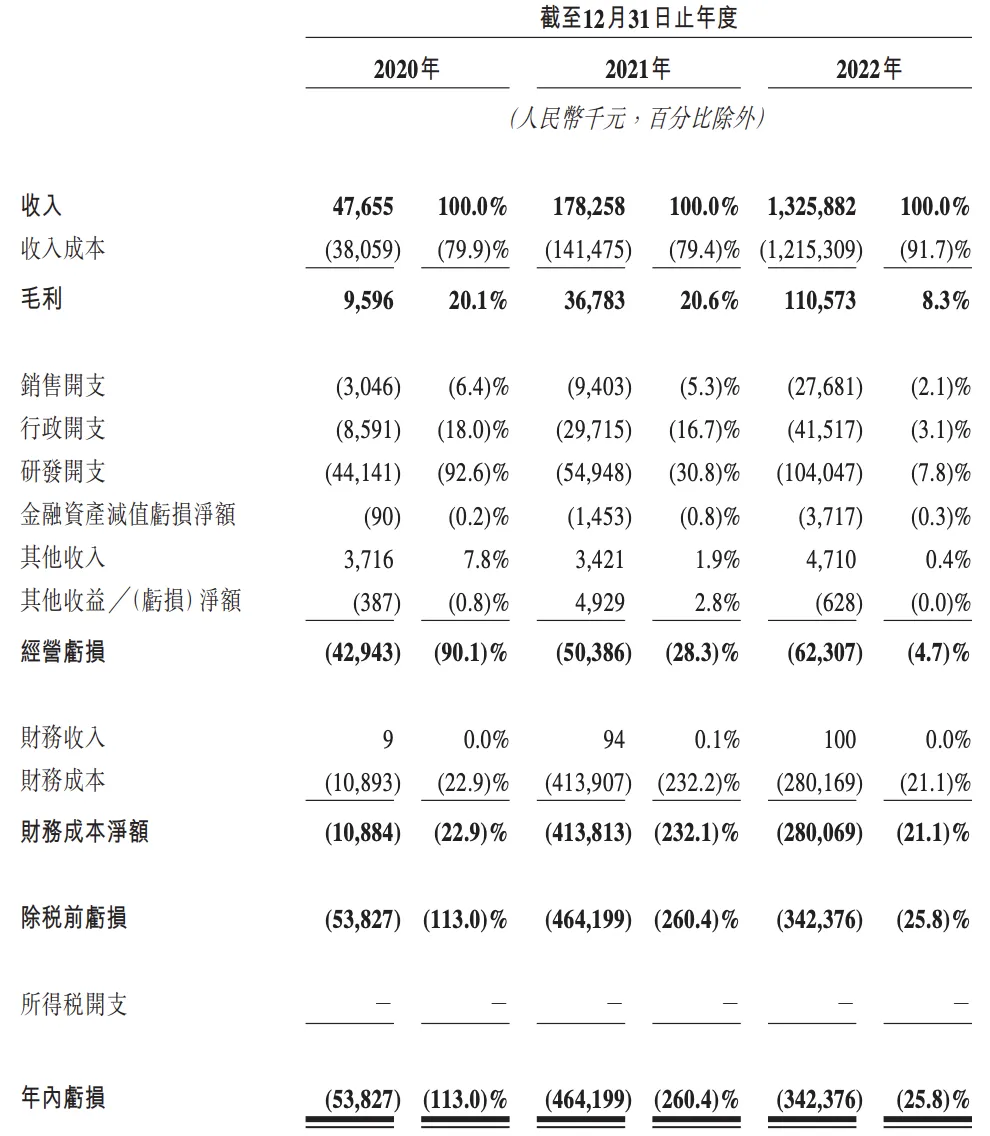 不过整体来看,知行科技的收入保持高速增长的趋势,2020-2022年的复合年增长率达427.2%,而2022 年的同比增幅更是高达644%。