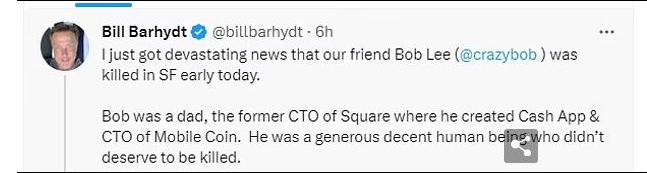 鲍勃生前所就职的MobileCoin 的首席执行官Joshua Goldbard也证实了这一消息,在一份声明中写道:我们亲爱的朋友和同事Bob Lee于昨天去世,享年43岁,幸存下来的是一个充满爱的家庭以及一群亲密的朋友和合作者。