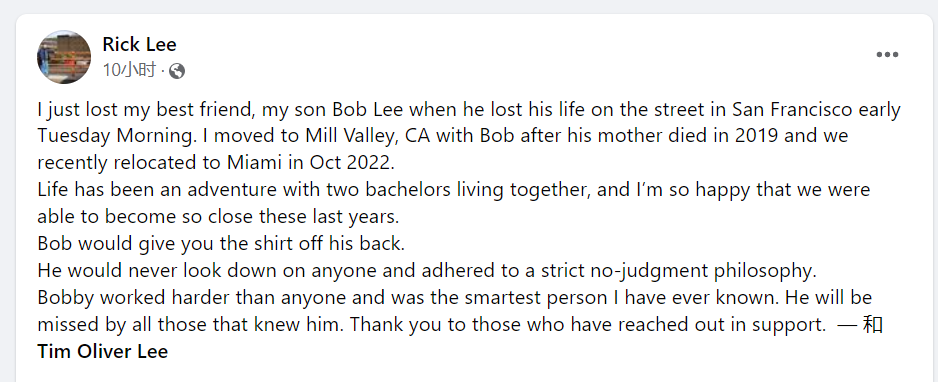 随后鲍勃·李的父亲瑞克·李,周三上午在社交媒体上证实了儿子的去世:“我刚失去我最好的朋友,我儿子鲍勃·李4日清晨在旧金山街头丧生,感谢那些伸出援手的人。”