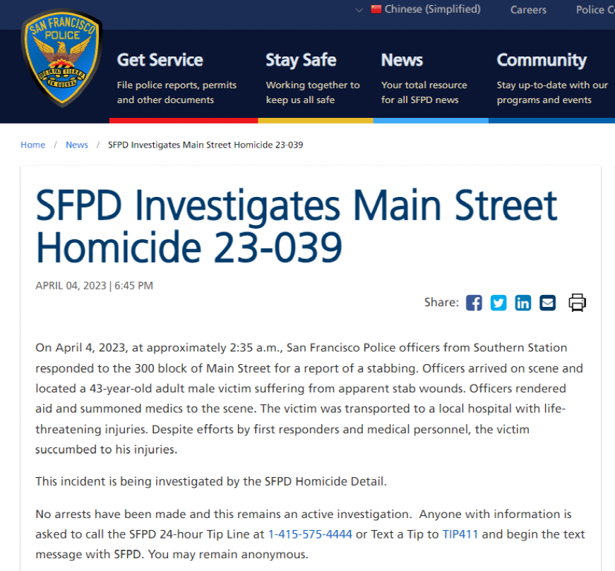 旧金山警察接到民众通报后,赶到了海滨附近主街300号街区,一座大厦的门口,并那儿发现了一名受伤男性,身上有多处捅伤,当时已经失去了意识。