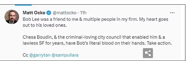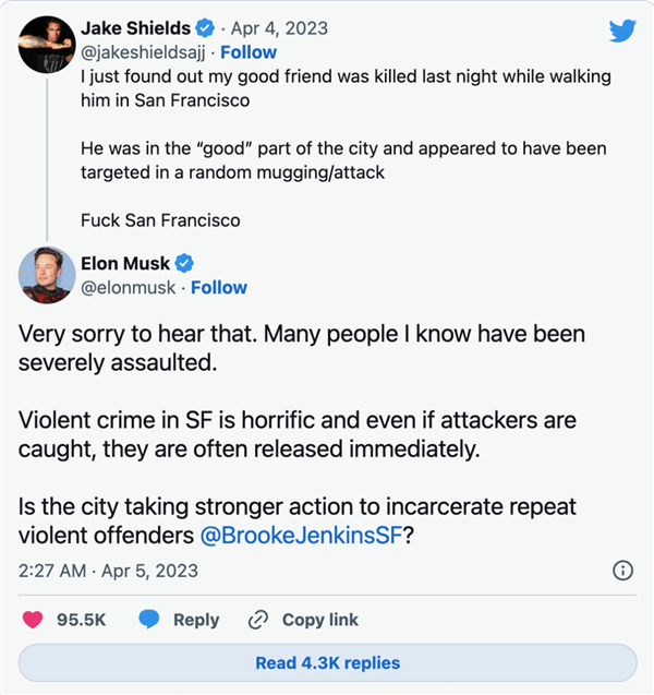 一时间,美国旧金山街头的治安也被点名,马斯克也公开发表言论表示哀悼,并质问了旧金山检察官在 "监禁反复的暴力犯罪者 "方面到底做了什么?