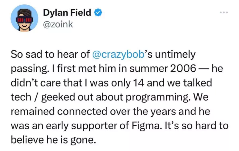 Figma首席执行官Dylan Field在Twitter上写道。听到crazy bob英年早逝的消息,我感到非常难过。我第一次见到他是在2006年夏天,他并不介意我只有14岁,我们谈论了技术和极客编程。多年来,我们一直保持联系,他是Figma的早期支持者,很难相信他已经走了。”