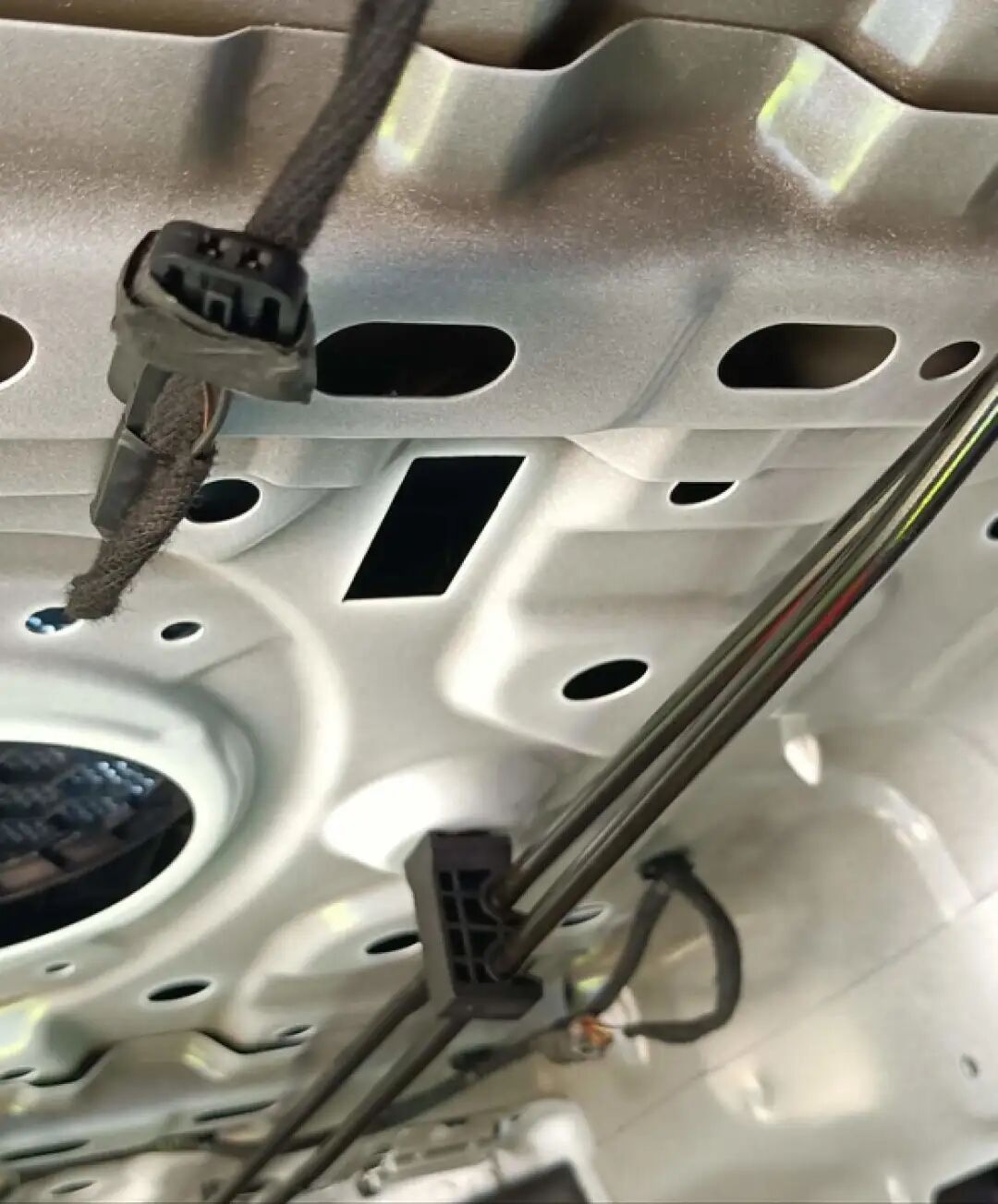 为了增加配置,他自己改过音响,因为这款车的B柱饰板不知道怎么拆,最后勉强把高音透塞进去了,做了隔音加装dsp后,功放和低音炮效果好多了,但后面喇叭没办法加柱。