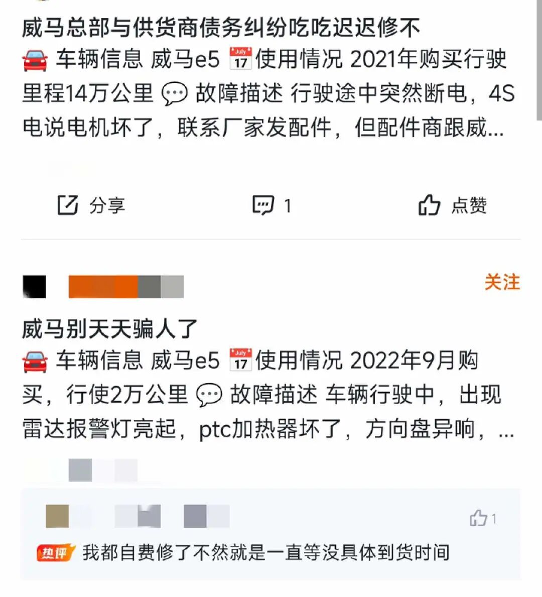 维修没有配件,官方售后几乎停滞,是目前威马车主遇到的最大难题。