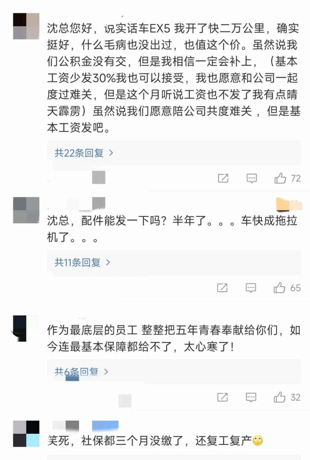 其创始人沈晖的微博评论也被谩骂包围,在一条宣布威马会保证复工复产的消息下,评论几乎全是威马的车主和员工,有要零配件的,有要工资和社保的,言语中都透露着对威马的失望和寒心。