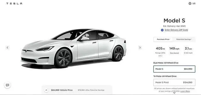 以Model S为例,Model S已经从2022年底的104990美元(约合人民币72万元)降至84990美元(约合人民币58万元)。