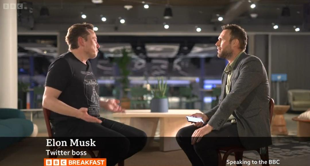 这场访问的起因就有些戏剧化,先是马斯克在推特上给BBC添加了一个标签“Government Funded Media(政府资助的媒体)”,然后BBC发现后,打算派个记者“登门拜访”。