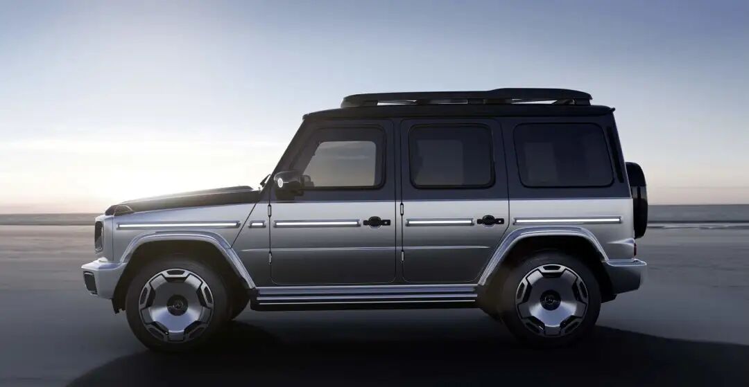 车身侧面的造型近乎完全保留了燃油版大G的经典造型风格,线条刚毅硬朗,车窗方正规矩。尽管这已经是一台没有发动机的“大G”,但是为了保留原汁原味的硬派SUV风格,前发动机舱盖的设计还是得到了保留。