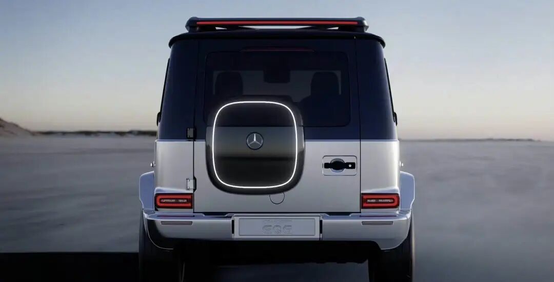 车身尾部造型与燃油款大G如出一辙,外挂式“小书包”的造型也没有缺席,但是不同于燃油版G级越野车在尾门上配备备胎罩,EQG概念车尾门上则是一个带有锁扣并配备白色LED光源的尾门收纳盒,用于放置充电器等相关物品。
