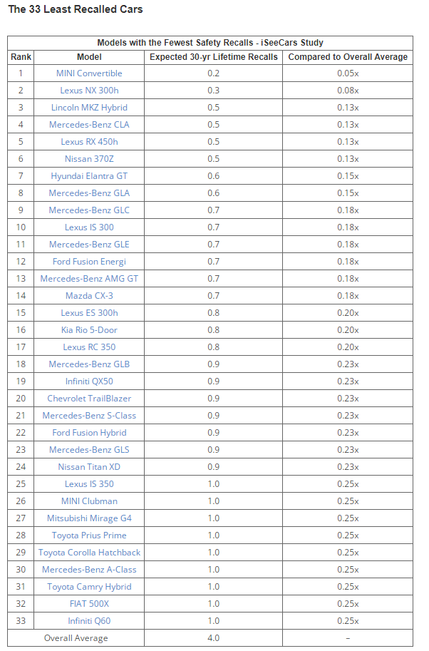 相反,在预计30年使用寿命内召回次数最少的车型中,奔驰、雷克萨斯和丰田占据了大部分席位,它们大多数车型平均召回次数甚至不到一次,而最少的是 MINI Cooper 敞篷版,只有 0.2 次的召回次数。